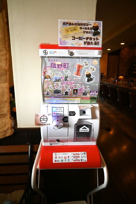 街ガチャ稼働初日、私がいちばん欲しいと思ったのは「コーヒーゼリー」のキーホルダー。菰野町役場の方から「コーヒーゼリーのカプセルにはコーヒーチケットが入っていますよ」と聞き、背中を押されるように「珈琲屋 真戸運永(まどんな)」へ向かいました。