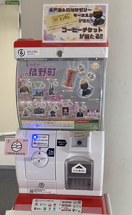 初日の午前中だけで、3人のお客さんが4回挑戦したそうです。1人の方は日本酒田光のキーホルダーが、もう一人は五百羅漢が出ました。コーヒーゼリー狙いで回した方は、1回目に五百羅漢、2回目で見事コーヒーゼリーを引き当てたとのこと。街ガチャは10種類が均等に入っているため、狙いのものが出る確率は10分の1です。